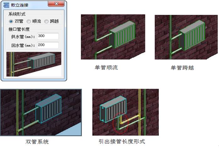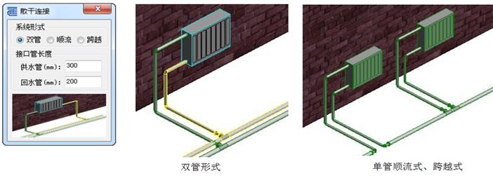 【散干連接】:可實(shí)現(xiàn)散熱器與干管的連接,支持雙管系統(tǒng),單管順流式和單管跨越式系統(tǒng)形式。支持設(shè)置自動(dòng)生成的支管的管線長(zhǎng)度。
