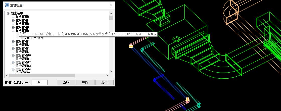 水系統(tǒng)管線編輯及調(diào)整:軟件提供對(duì)管道的編輯功能,支持通過(guò)管道刷批量修改管道參數(shù),支持批量生成、刪除管道保溫操作。軟件可以通過(guò)對(duì)齊、對(duì)正、管線等距等功能快速完成管線的微調(diào)操作,通過(guò)管線避讓功能快速完成碰撞構(gòu)件的避讓調(diào)整操作,通過(guò)管線貼梁功能一鍵完成管線貼梁、貼板操作,重管檢測(cè)命令可以方便快捷的檢測(cè)到項(xiàng)目中重合管線并進(jìn)行定位亮顯,該命令用于檢查項(xiàng)目中某距離范圍內(nèi)的管道重合情況,對(duì)重合管線定位亮顯可以有效實(shí)現(xiàn)對(duì)重合管線進(jìn)行修改。