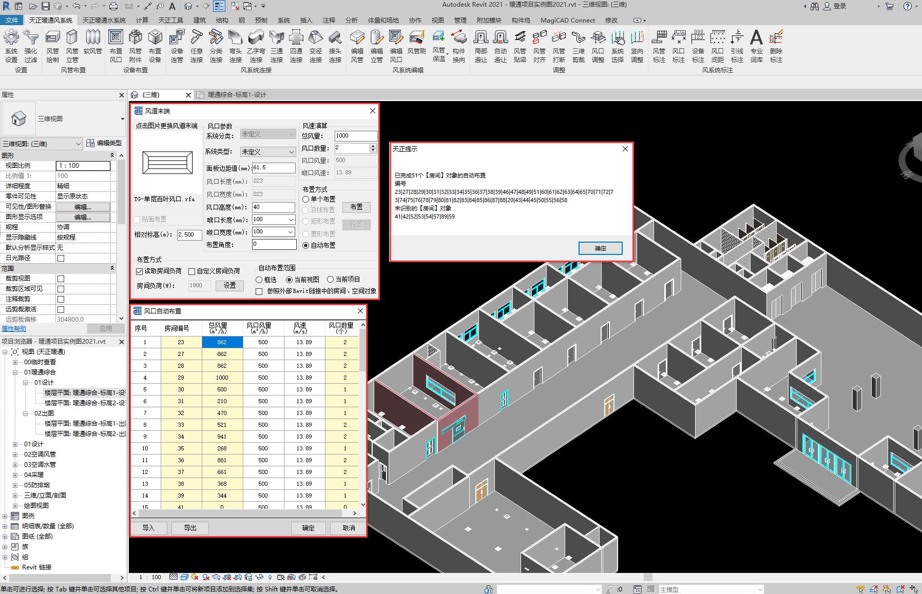 設(shè)備布置:軟件提供豐富的風(fēng)口、風(fēng)管閥件以及常見(jiàn)設(shè)備族庫(kù);提供多種常用風(fēng)口末端族,支持多種方式進(jìn)行風(fēng)口布置,其中自動(dòng)布置風(fēng)口功能支持批量提取負(fù)荷計(jì)算后算得房間、空間負(fù)荷值,并將計(jì)算后需要的風(fēng)口數(shù)量均勻布置在房間內(nèi)部;快速布置風(fēng)管閥門(mén)閥件、過(guò)濾器、靜壓箱、消聲器等附著于管線的設(shè)備。