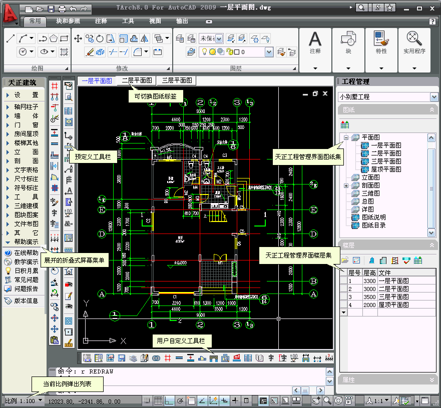 天正建筑引入了工程管理概念,工程管理器將圖紙集和樓層表合二為一,將與整個工程相關(guān)的建筑立剖面、三維組合、門窗表、圖紙目錄等功能完全整合在一起,同時進(jìn)行工程圖檔的管理,無論是在工程管理器的圖紙集中還是在樓層表雙擊文件圖標(biāo)都可以直接打開圖形文件。