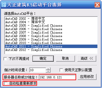 TArch 8.5在程序啟動對話框中可雙擊選擇需要的CAD平臺啟動,天正軟件與CAD平臺的安裝不分先后。點擊“高級”按鈕,在擴(kuò)展對話框中可以設(shè)置是否需要聯(lián)網(wǎng)檢查程序有無更新版本。網(wǎng)絡(luò)版的軟件可以在此對話框中修改服務(wù)器地址。