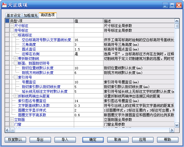 天正選項和自定義設(shè)置均可導(dǎo)出成XML文件,供貴單位其他8.5用戶導(dǎo)入,實現(xiàn)參數(shù)配置的共享,也可通過“恢復(fù)默認(rèn)”恢復(fù)程序最初設(shè)置值。