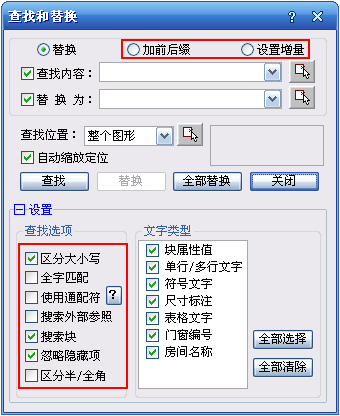 全新的查找替換功能,可為指定文字增加前后綴或進(jìn)行增量替換,增加對外部參照與塊參照內(nèi)部文字以及通配符的支持,支持設(shè)置是否全字匹配、是否區(qū)分大小寫等,支持對某一指定類型的對象進(jìn)行相關(guān)操作。