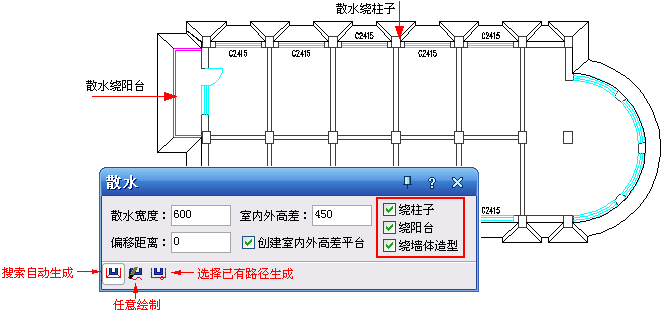 5) 散水增加直接繪制或選擇已有路徑生成兩種方式,在搜索自動生成散水時增加是否需要繞墻體造型的設(shè)置,增加對散水全局寬度的修改;