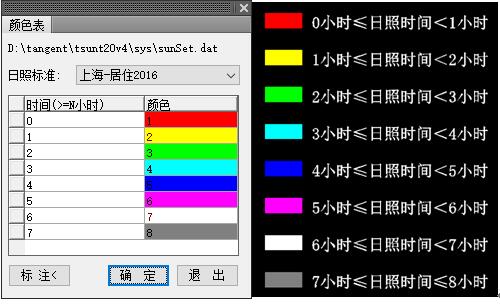 T20-Sun中各種日照分析命令的輸出結(jié)果(包括數(shù)字、曲線)的顏色可以通過顏色表定制,按照用戶的要求自動輸出,定制一次便可一勞永逸。