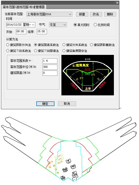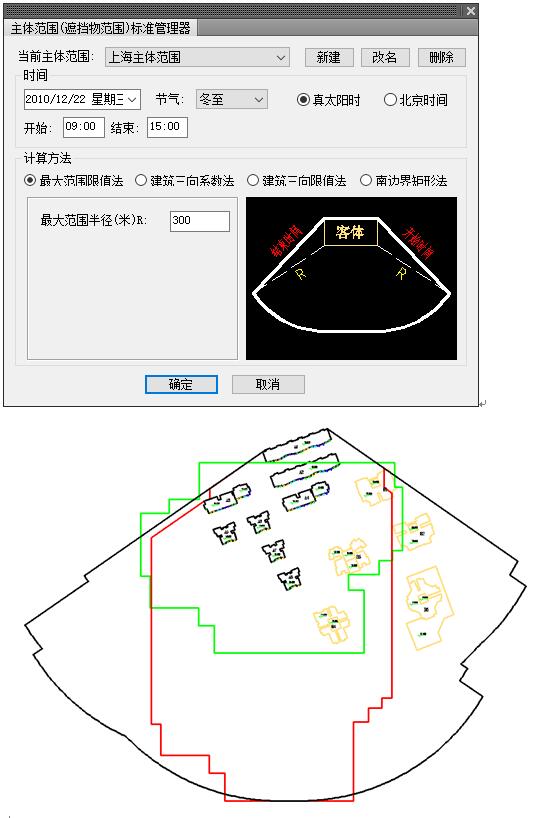 根據(jù)被陰影遮擋客體建筑物的位置,求出在指定日照時間段和特定計算規(guī)則下可能對其產(chǎn)生遮擋的主體建筑的范圍。用戶可以到“主體范圍標(biāo)準(zhǔn)管理器”中設(shè)置主體范圍計算規(guī)則,并可以導(dǎo)入導(dǎo)出標(biāo)準(zhǔn)參數(shù)。
