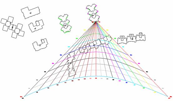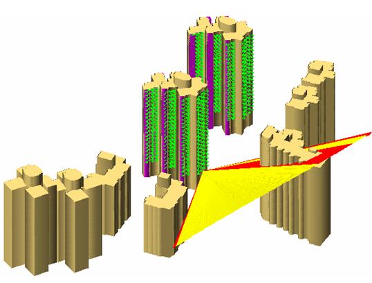 日影棒圖是采用不同高度的虛擬直竿產(chǎn)生陰影原理,按指定測算時刻獲得一系列的放射線,表示落影的長度和方向。反日影棒圖提供三維著色功能,選擇遮擋物時,光線可以在遮擋處斷開,因此可以通過狀態(tài)欄查詢光線與建筑物的相交位置。