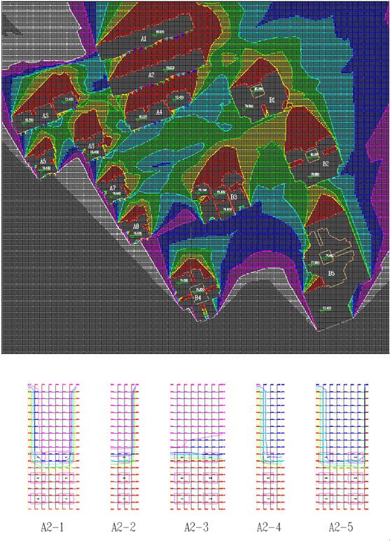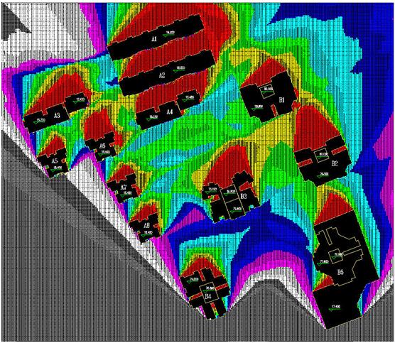 對建筑輪廓線上的采樣點進(jìn)行日照分析,在輪廓線上生成各采樣點的日照時間。可以采用“惡化分析”方式進(jìn)行建筑群建設(shè)前后日照時數(shù)的變化程度分析,并可以定義不同的計算高度,統(tǒng)一進(jìn)行日照分析。