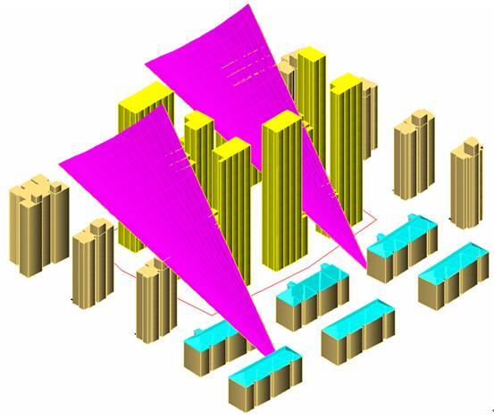 對切割器或光線圓錐范圍內(nèi)的遮擋建筑部分進(jìn)行切割,用于調(diào)整擬建建筑三維體塊大小。