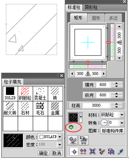 2. 天正【標準柱】命令對話框中提供了圖案填充的設置,可以在繪制柱子的同時完成圖案填充。在【標準柱】對話框中打開填充開關,(程序會根據當前所選柱子材料自動對應填充圖案)繪制出的柱子即帶填充圖案。